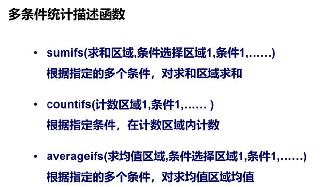 此外,Excel还设置了单条件和多条件的统计描述函数,前者基于一定区域进行单一条件的判断,后者基于多个条件进行判断。满足判断后进行求和、计数等函数。