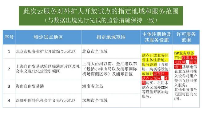 为贯彻落实党的二十大精神和中央经济工作会议部署,推进高水平对外开放,主动对接国际高标准经贸规则,持续优化外资营商环境,服务构建新发展格局,工业和信息化部决定开展增值电信业务扩大对外开放试点工作,[37]按照此前先行先试的实践,地点分别选在条件最为成熟、跨国公司在华经营和研发企业最为集中的北京[38]、上海[39]、海南[40]和深圳[41]。北京和上海分别为跨国公司总部的所在地且高端服务业领先全国[42],海南为中国特色的高水平自由贸易港[43],深圳为中国高新科技产业制造和新兴技术研发中心[44],客观上在华业务开展对国际商业运营普遍使用的云服务需求最为突出且持续增加。[45]