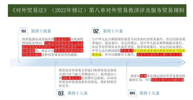 中国对外贸易法律制度建设更趋完备,更需要提前预判形势立法先行,针对国外服务及其产品对国内产业的损害或损害威胁影响,在2004年修订(第四十五条)和2022年修订(第四十四条)设立了完备的服务贸易救济条款和其他配套实施的条款。同时,服务贸易救济条款与在利益丧失或减损时,中止或终止履行相关义务条款(第四十六条)、国际服务贸易等预警应急机制(第四十八条)、反规避措施(第四十九条),构成了规定系统完整、实施递进互异、平衡权利义务、接轨国际规则的服务贸易规制体系,彰显了中国对外经贸立法的前瞻性、创新性、实用性和国际性。