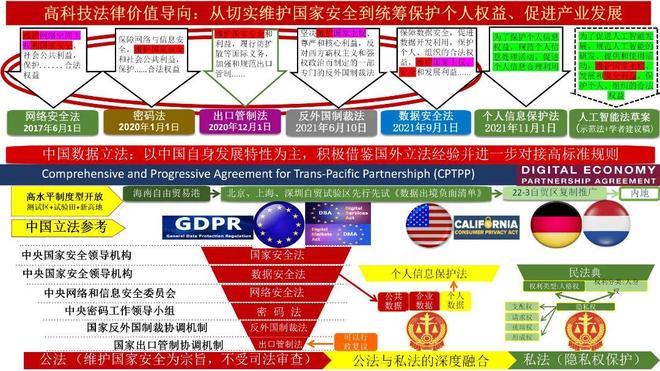 同时,中国面对蓬勃发展的数字经济,特别是高科技法律规制(其中很多是高端服务贸易的底层技术法律规制),进行了系统、周密、稳妥的立法规划并卓有成效地进行推进,[35]体现了中国颇具长远战略眼光的立法理念、非常前沿高超的立法技术、十分成熟的立法技巧,特别是区分具体特定数据跨境在自由贸易港和自贸试验区先行先试的规划。[36]具体情况请见附图:
