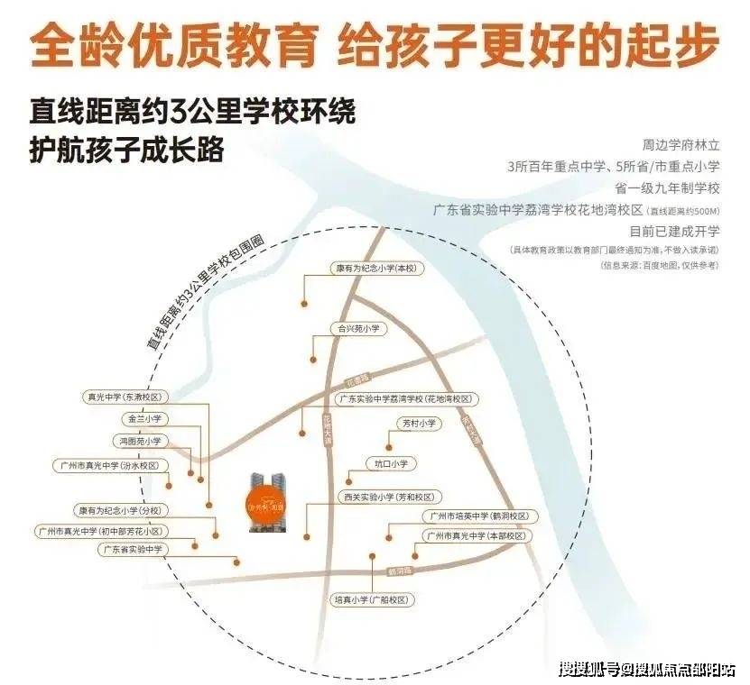 项目自身配建了一所9班幼儿园,距离花地湾省实学校直线米,周边还有真光中学、康有为小学、培英中学等名校