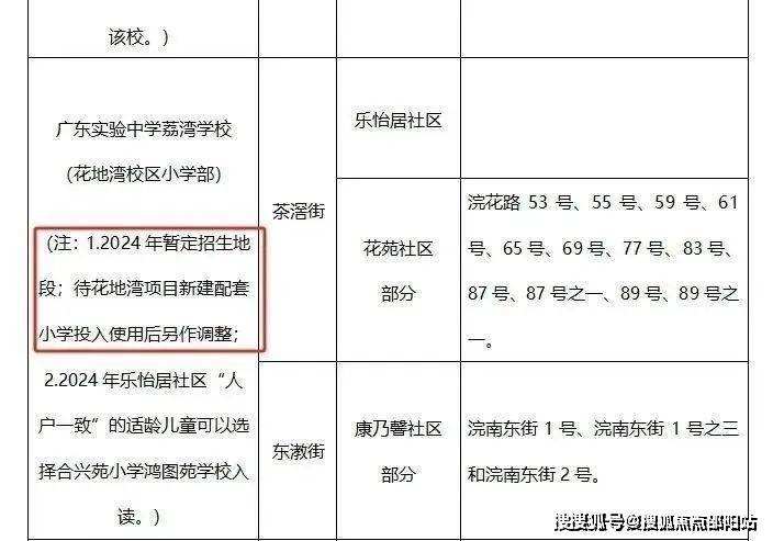 当然,今年省实的招生表上有个注明:“2024年暂定招生地段;待花地湾项目新建配套小学投入使用后另作调整”,即今年暂定这样,之后可能会有变动,所以具体还是要以当年的教育局招生计划为准。售楼处电话: